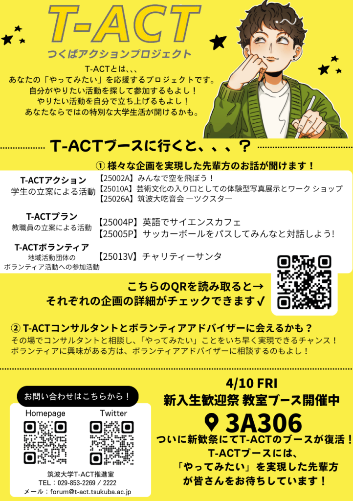 本企画は、つくばアクションプロジェクト(T-ACT)の新入生への認知度を高めるとともに、少しでも気軽に参加する気持ちになれるよう、T-ACTの各企画紹介と参加のしやすさを発信することが目的です。