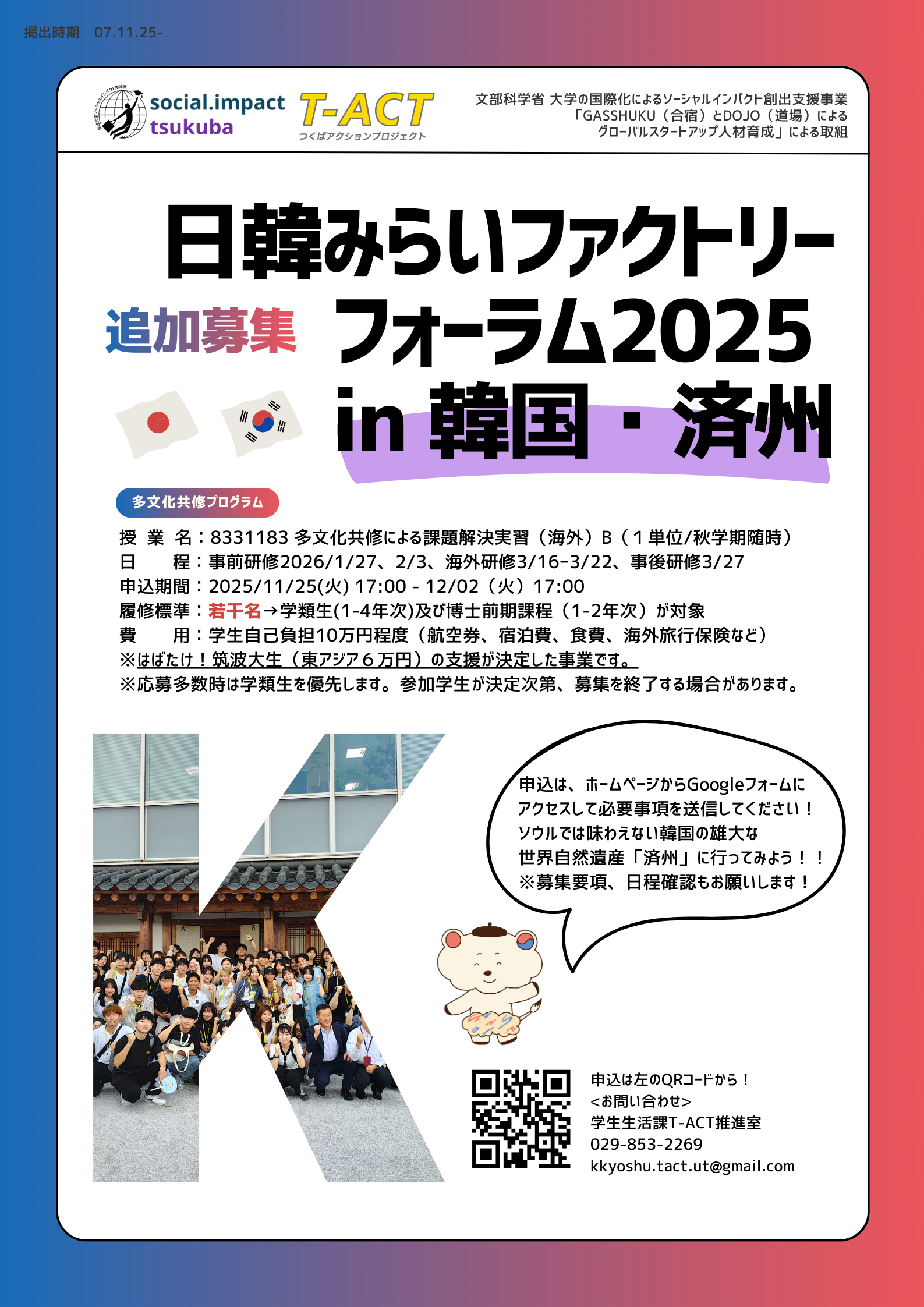 (追加募集要項)韓国での多文化共修による課題解決型実習